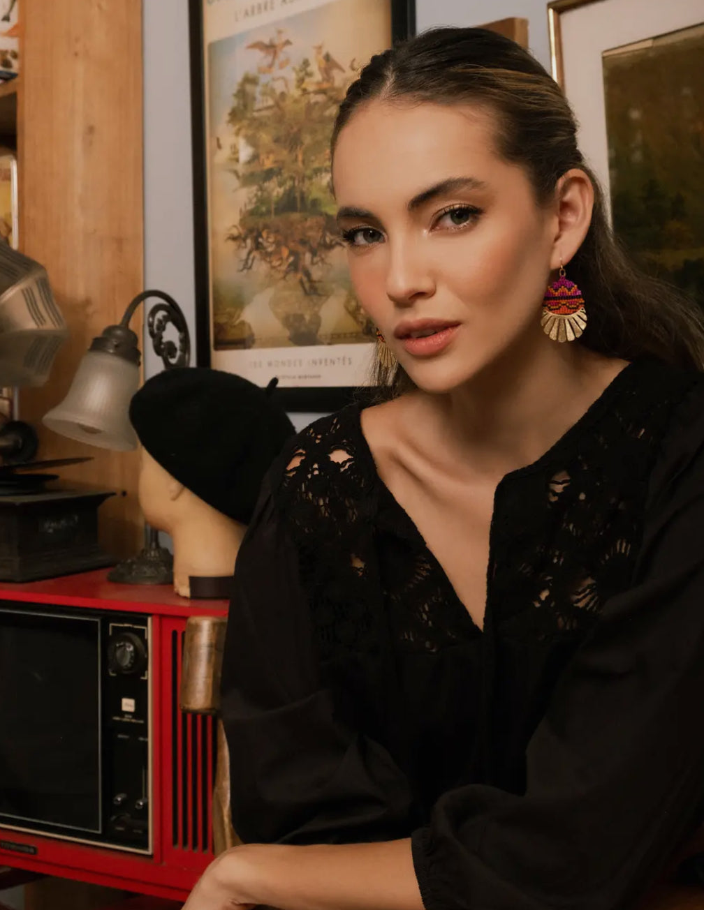 Our Santa Fe Drop earrings are handwoven by women artisans from vulnerable communities in Medellin, Colombia who receive fair working conditions and compensation for their skills as is detailed on the back of our earring cards.