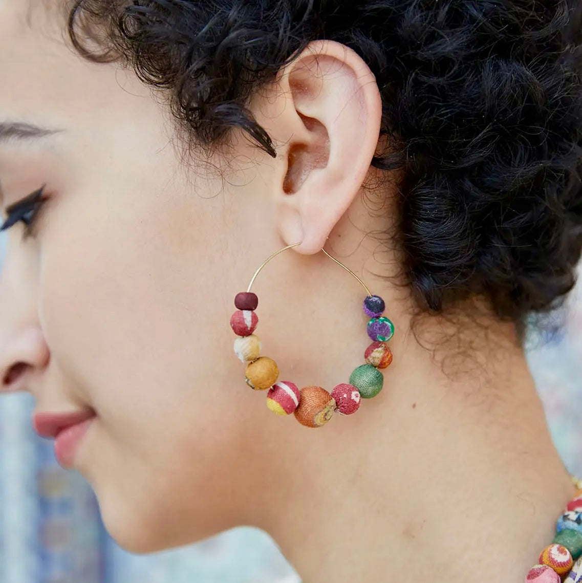 Chunky, lightweight and fun! Colorful, repurposed Kantha textile beads gradually increase and decrease in size to form the perfect hoop.