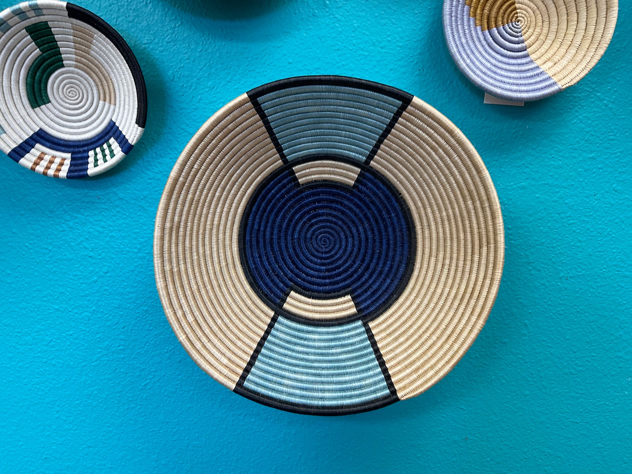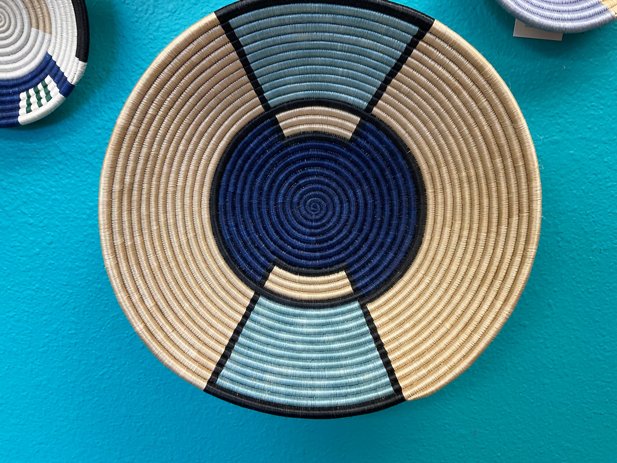 This sisal, woven basket is approximately 16" in diameter and woven by our artisans in Gitarama, Rwanda. The sisal is woven around sweetgrass, a fragrant grass with a subtle sweetness. In addition to making a beautiful table display, these baskets can also be hung as art. There is a loop on the back for hanging.