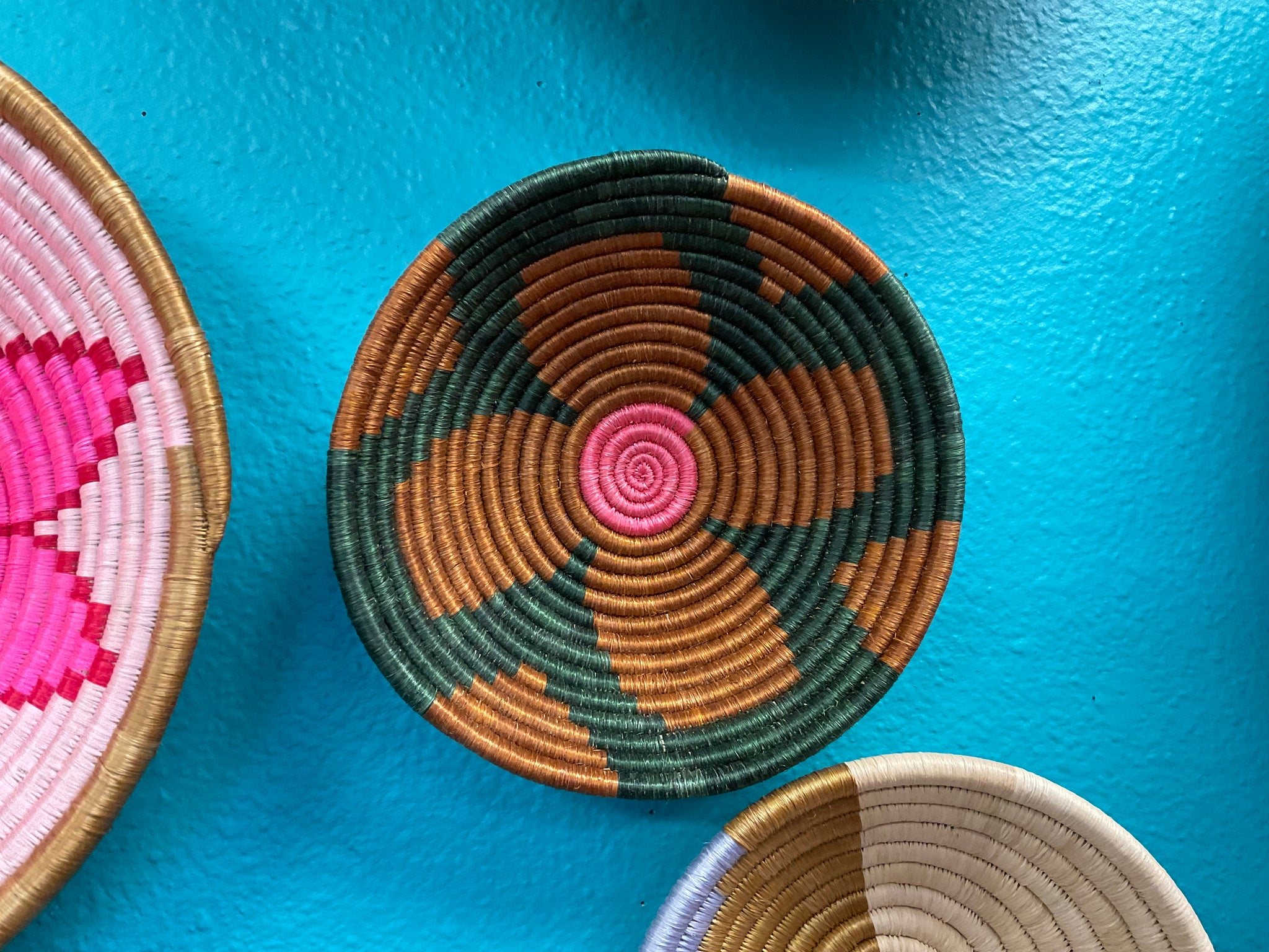This sisal, woven basket is approximately 8" in diameter and woven by artisans in Gitarama, Rwanda. The sisal is woven around sweetgrass, a fragrant grass with a subtle sweetness. In addition to making a beautiful table display, these baskets can also be hung as art. There is a loop on the back for hanging.