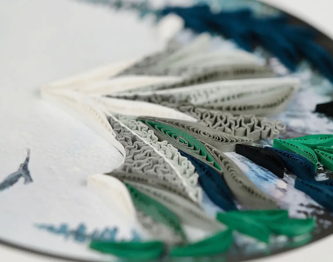 Celebrate the creation of snow filled memories with this handcrafted mountain peak greeting card. This beautiful quilled snowy mountain top is highlighted by the silver embossed circle. This card would be ideal for a a winter sport lover or anyone you think is.