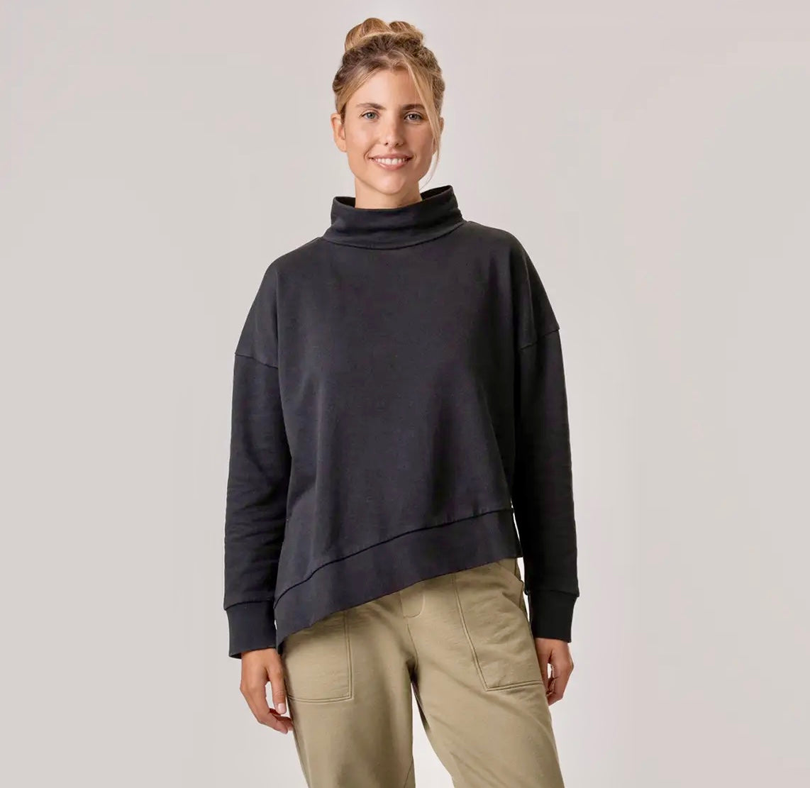Soft and warm french terry with a mock neck and asymmetrical hemline. Easy fit that pairs well with everything from our Maggie’s Surplus Pant and Surplus Skirt, leggings or jeans. Garment dyed for a soft, lived-in look.