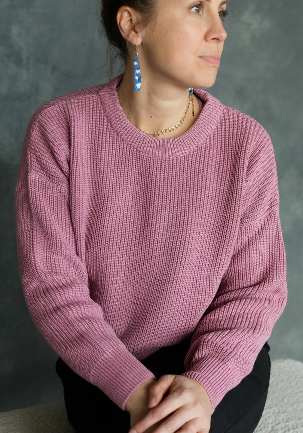 We love this cozy sweater at the shop! 100% organic cotton, it’s one size fits so many. It’s a great sweater to layer or wear alone. Knit by artisans in Nepal.